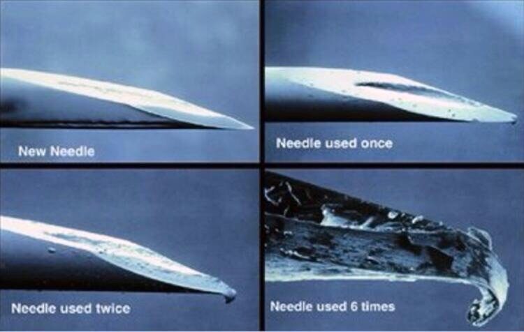 The image above highlights what happens to the needle, and in particular the needle tip, on multiple uses.