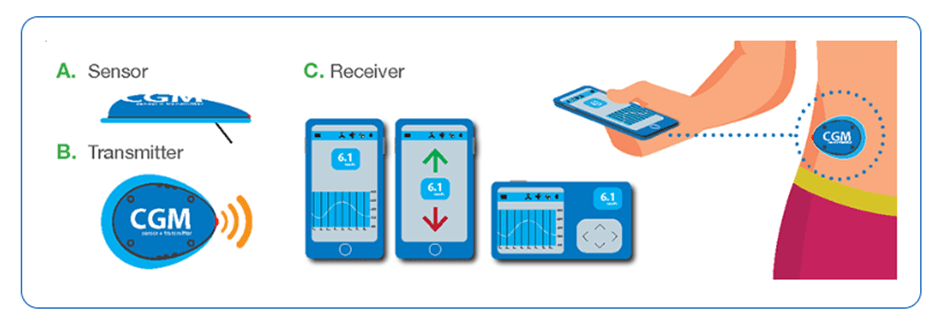1. A sensor, which is a single-use plastic device with a small electrode that gets injected under the skin. Once it is inserted correctly the sensor can stay in place for six or more days, depending on the system used. The insertion does not take more than a few minutes and is essentially painless. The electrode under the skin is constantly in contact with the interstitial fluid in the body and that is how it collects glucose data.